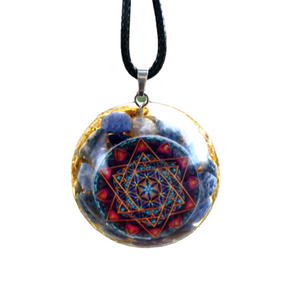 This unique orgonite pendant, made with sodalite crystal, gold leaf, and resin, is designed to support the activation of the third eye chakra.
