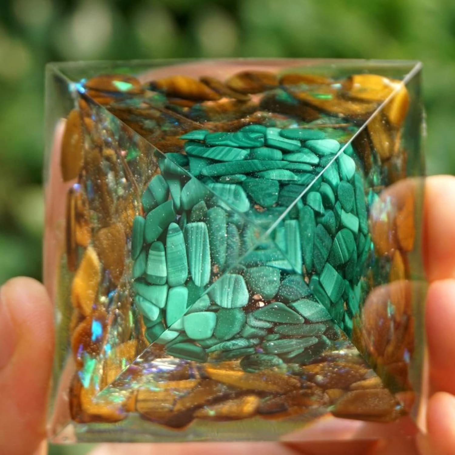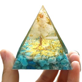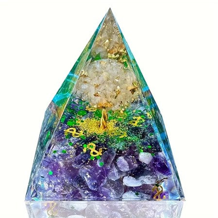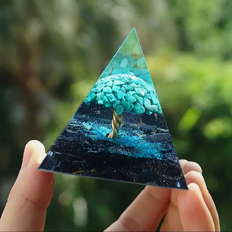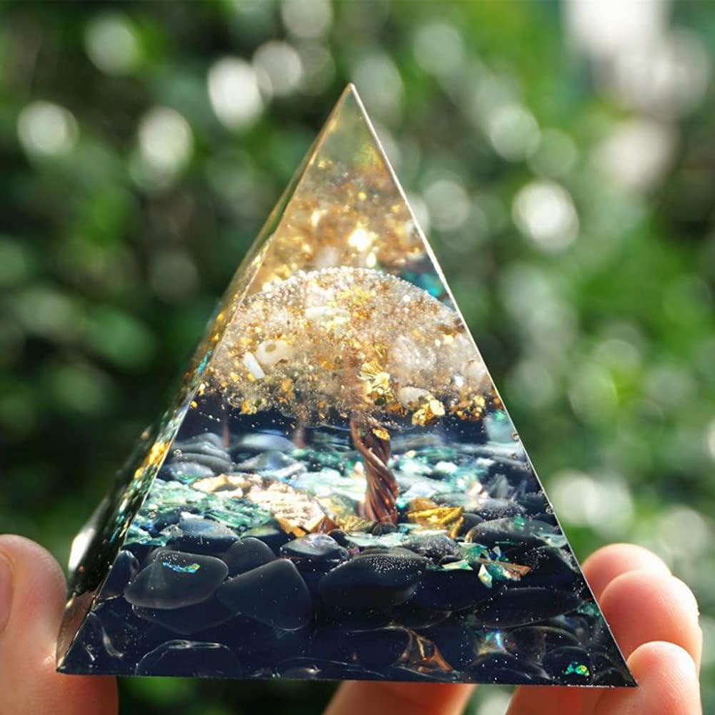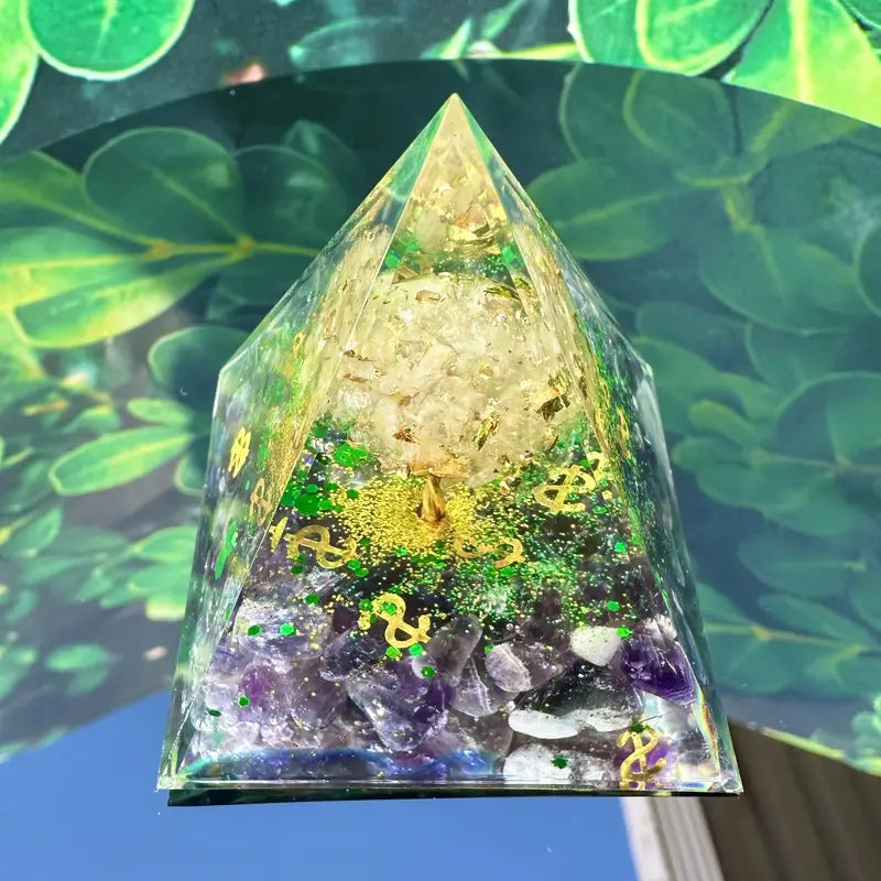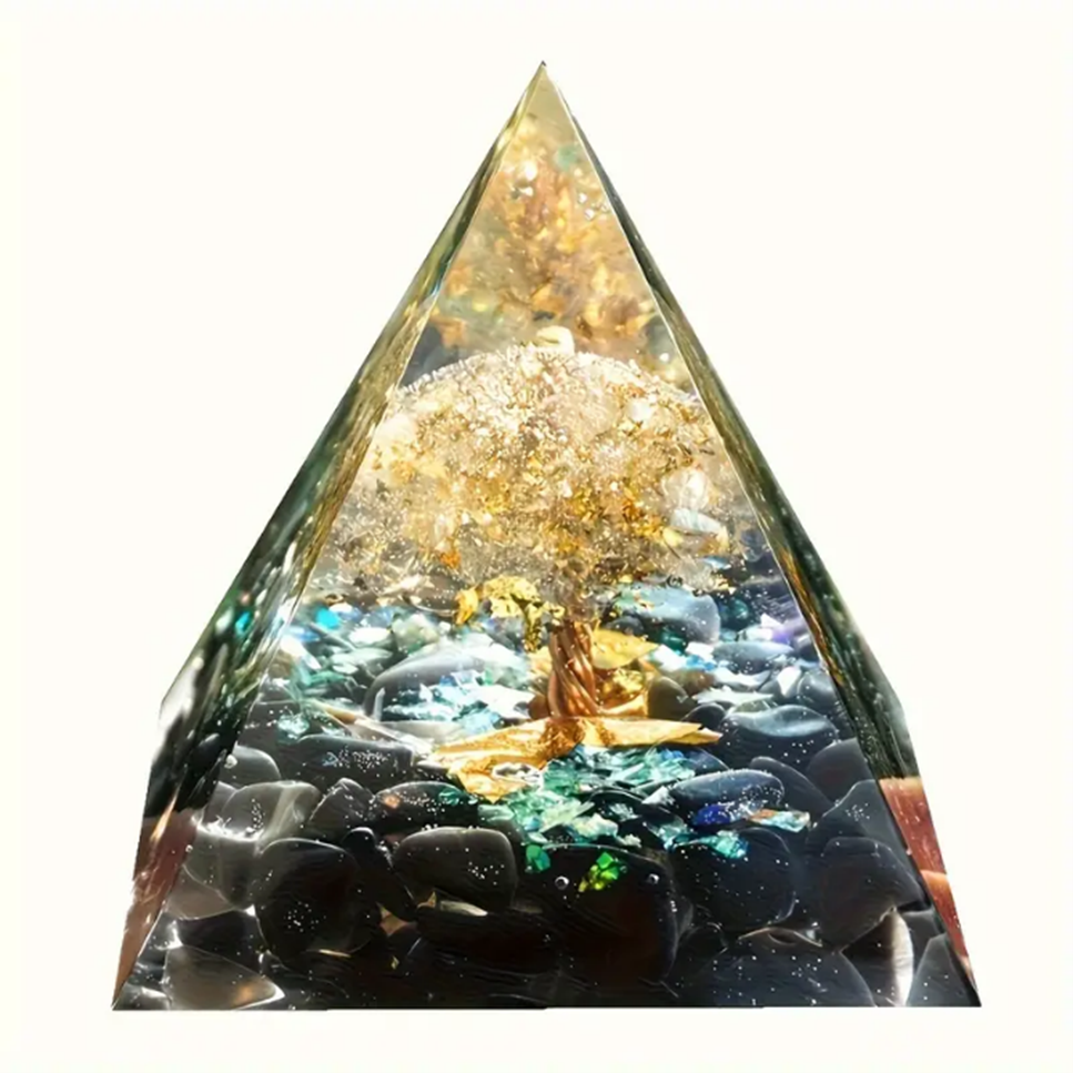 This stunning series of orgone pyramids merges the symbol of the Tree of Life with the marvelous power of nature, where heart and soul unite. Each pyramid is uniquely crafted, richly adorned with gemstones, and features trees made of copper and gold leaf, offering a breathtaking visual experience. These beautiful creations serve not only as aesthetic delights but also as true energy centers that enrich the space they inhabit.