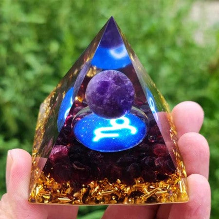 This special series of orgonite pyramids captures the essence of all 12 zodiac signs, elegantly blending the energies and powers of the associated semi-precious stones with gold and copper plates.