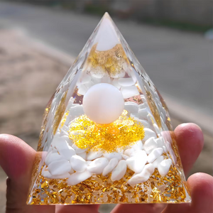 This stunning orgonite pyramid is not just an elegant decorative piece but also an effective energy purifier.